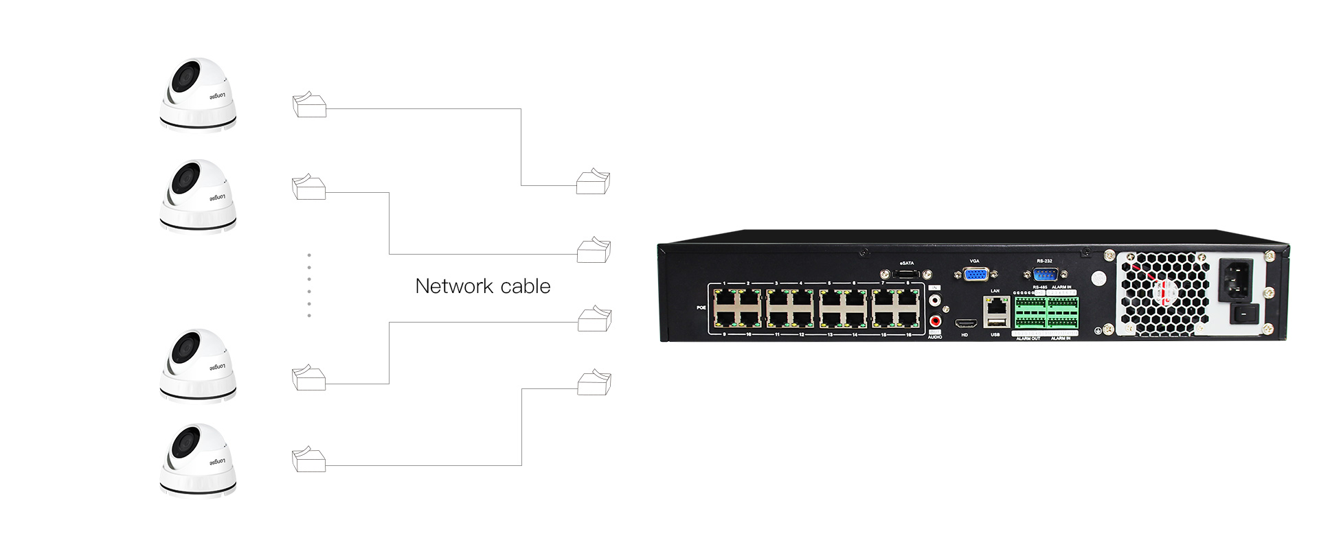 錄像機支持16個PoE通道,以一根網(wǎng)線的連接即可通電16個同時支持PoE的攝像機并可以進行
